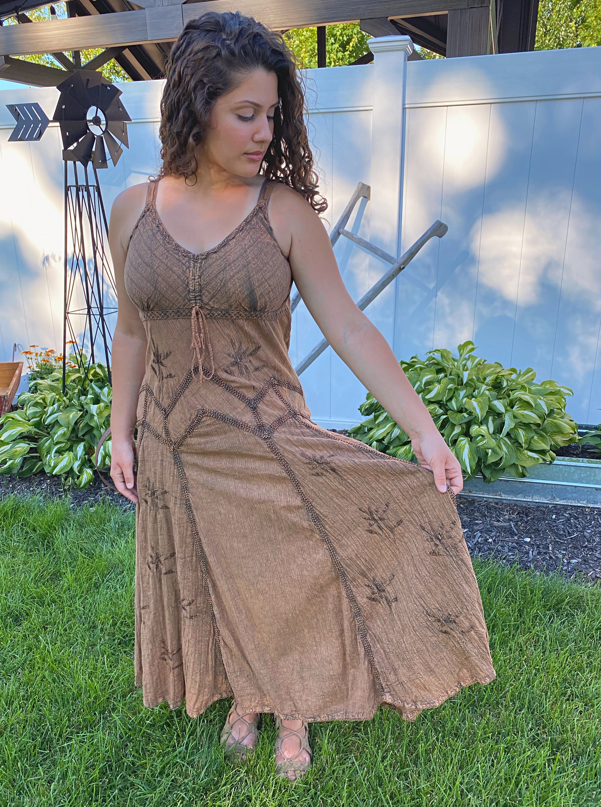 100% cotton multi-fabric long spaghetti strap dress with adjustable front tie and inside bottom ties for versatility. Machine cold with like colors.